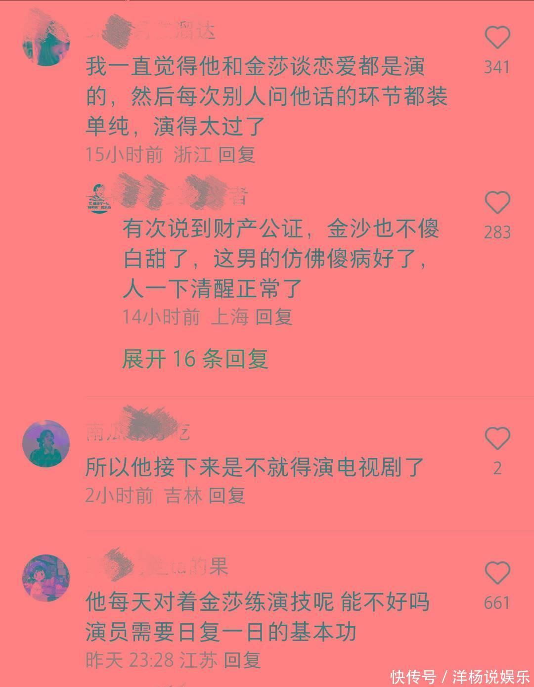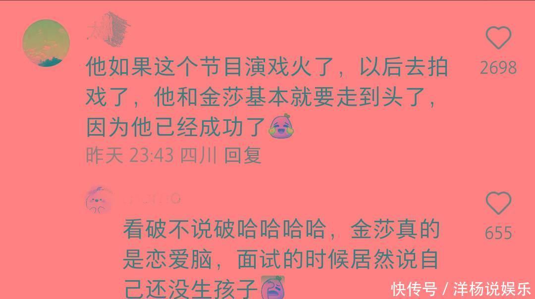 也有网友说他若是这个节目演戏火了,以后去拍戏了,他和金莎基本就要走到头了,因为他仍是到手了。